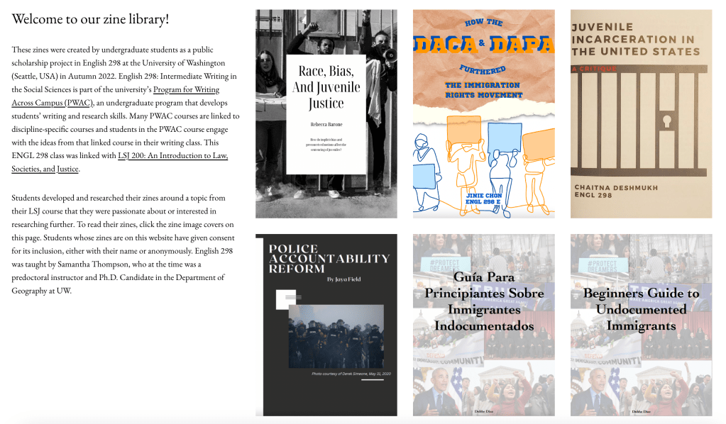 Throughout the term, students worked on a series of scaffolded assignments that culminated in a class public scholarship project. Students created zines about a topic from the course that they were interested in or wanted to learn more about. They then developed a zine which critically analyzed the topic, bringing together key course concepts and readings as well as their original research, while creating a piece of writing intended to communicate with a public audience. Students then had the option to include their final zine in the course’s public scholarship project which took the form of a public, online zine library.
